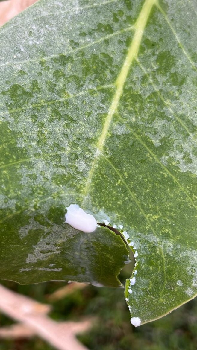 העלים של פתילת המדבר הם יצירת מופת של הנדסה בוטנית המותאמת לאקלים המדברי. הם גדולים, בשרניים (סוקולנטיים) ובעלי צבע ירוק-אפרפר או כסוף. הגוון הבהיר הזה אינו מקרי; הוא נוצר בזכות שכבת שעווה אפיקוטיקולרית (Epicuticular wax) עבה וכיסוי של שערות עדינות המכונות "לבד". שכבה זו מתפקדת כמעין "קרם הגנה" המגביר את האלבדו (Albedo) – החזרת קרינת השמש מהעלה – ובכך מונע את התחממות הרקמות הפנימיות. בנוסף, השעווה מצמצמת את איבוד המים בתהליך הדיות (טרנספירציה), מה שמאפשר לעץ להישאר ירוק ורענן גם בשיא החום של ים המלח.