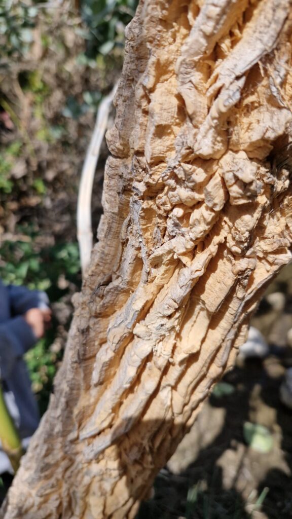 אחד המאפיינים המרתקים ביותר של פתילת המדבר הגדולה הוא הגזע שלה, המכוסה בקליפה עבה, חריצה ובעלת מרקם שעמי יוצא דופן. בניגוד לעצים בעלי קליפה קשה ונוקשה, הגזע של תפוח סדום מרגיש ספוגי ורך למגע—עד כדי כך שניתן ללחוץ עליו באצבע ולחוש את הגמישות שלו. מבנה זה אינו מקרי; הקליפה השעמית משמשת כבידוד תרמי מעולה. השעם מלא בבועות אוויר זעירות המתפקדות כשכבת הגנה מפני הטמפרטורות הקיצוניות של המדבר ומפני שריפות מזדמנות.