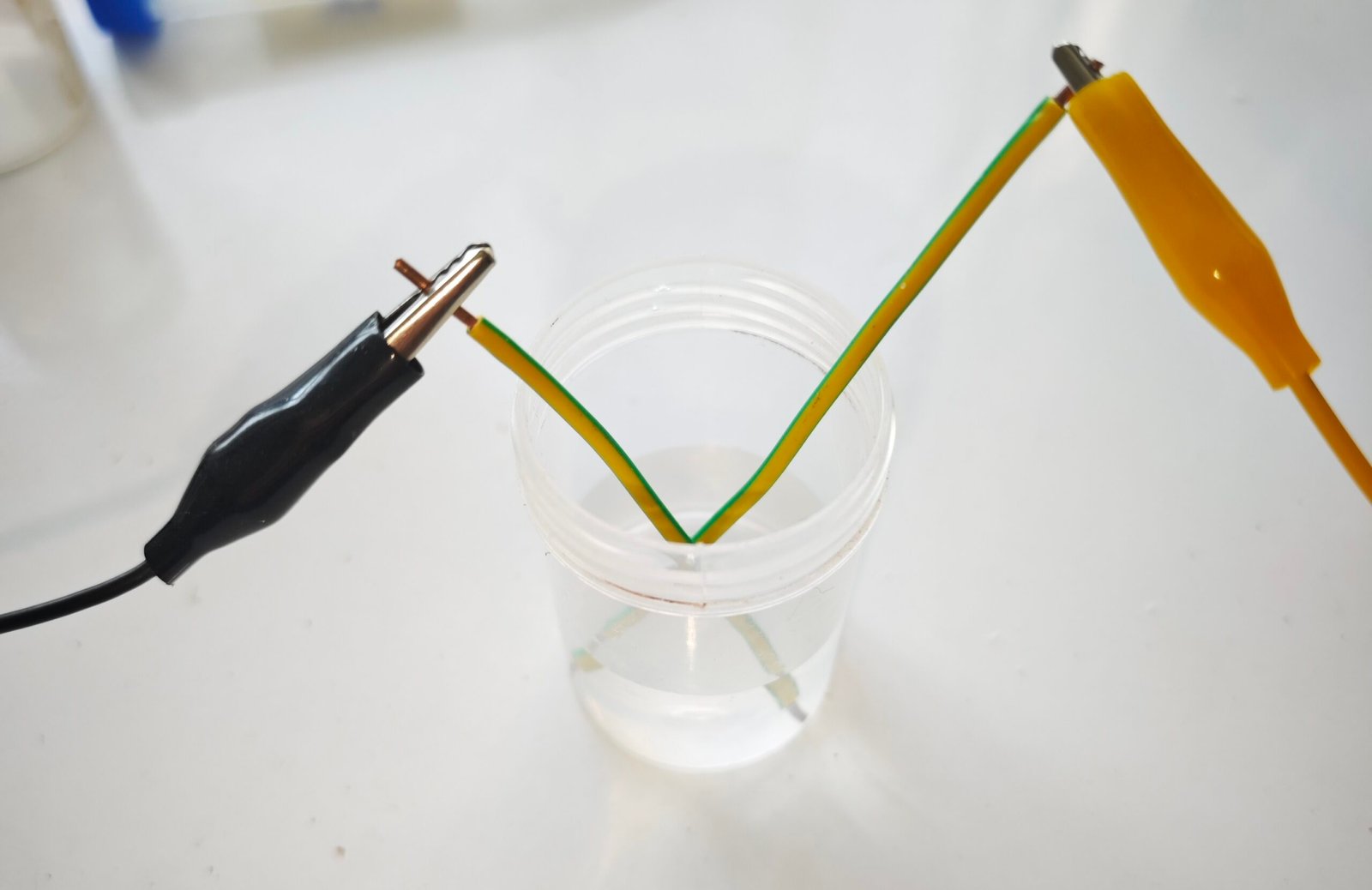 2. כעת יש לחבר את המעגל דרך המים המזוקקים. נתקו 2 תילים זה מזה (בתמונה 1 את השחור לנתק מהצהוב). חברו כל תנין לאלקטרודת נחושת (למניעת החלדה) והכניסו את אלקטרודות הנחושת לתוך המים המזוקקים כמתואר בתמונה: