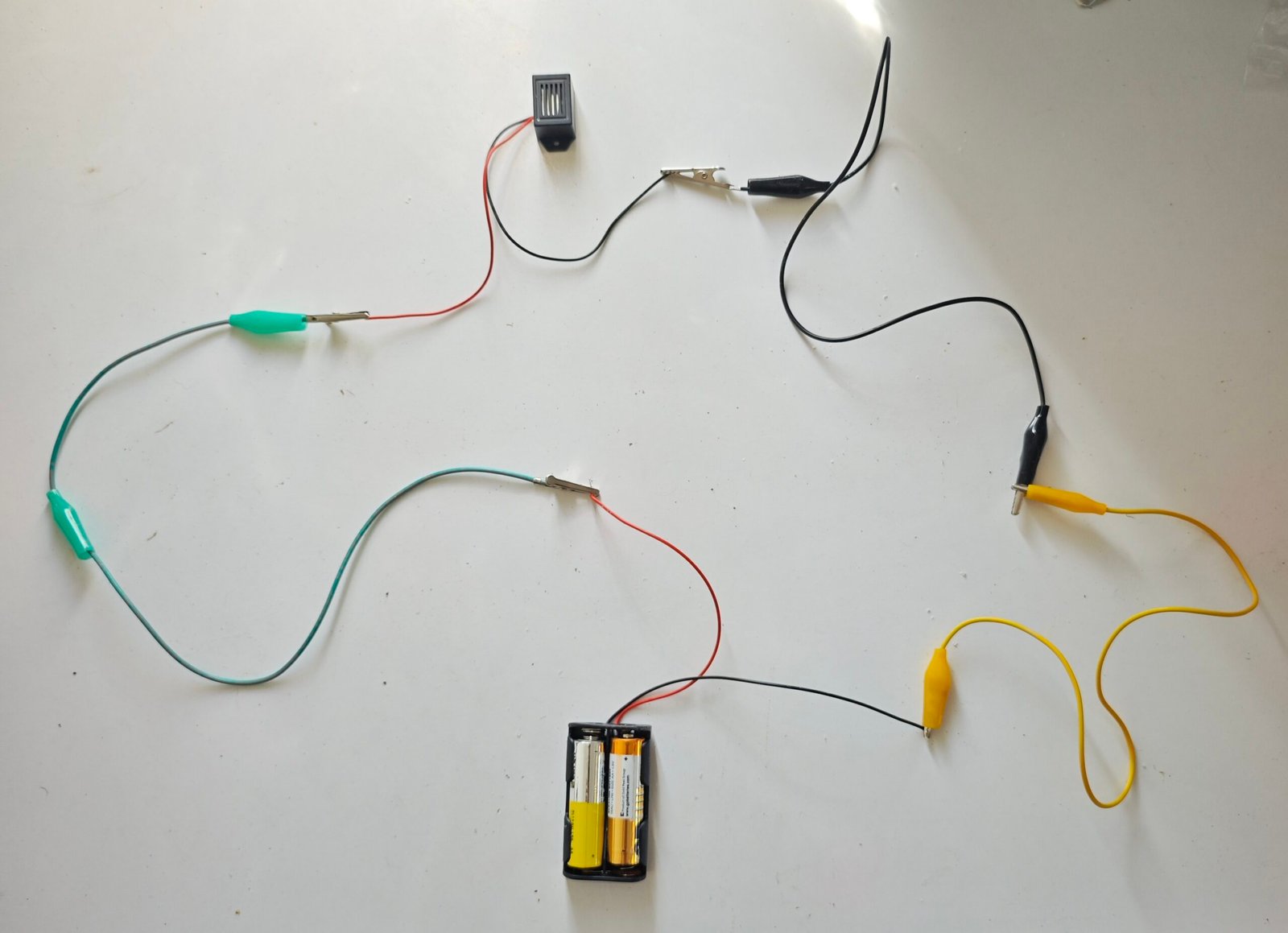 - חברו את המעגל החשמלי בתמונה באמצעות 3 התילים המוליכים. שימו לב שהתיל השחור מהסוללות מחובר לתיל השחור של הזמזם (לא ישירות) והתיל האדום של הסוללה מחובר לתיל האדום של הזמזם. בדקו שהכל במעגל עובד והזמזם מזמזם.